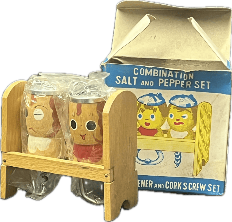 Combination salt and pepper shakers and bottle openers with cartoon faces from the 1960s.