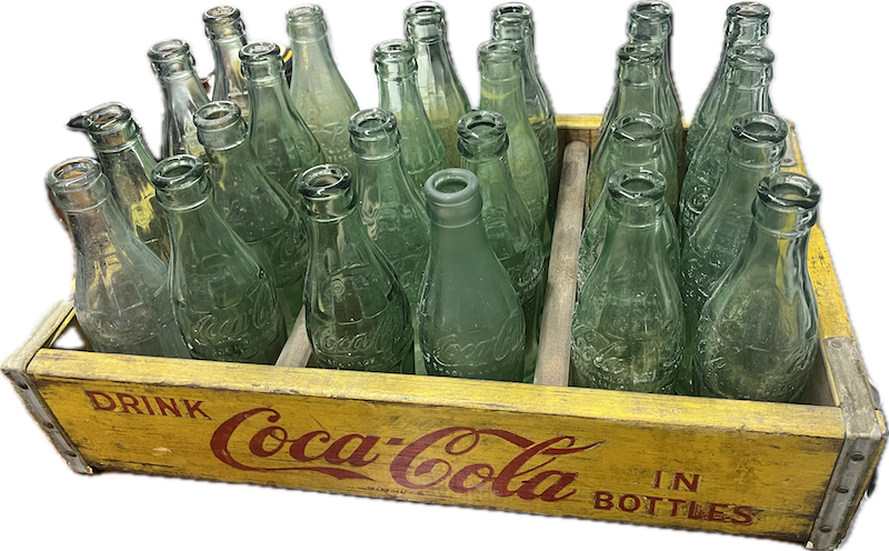 24 green glass Coca-Cola bottles in original yellow crate with signature red lettering.