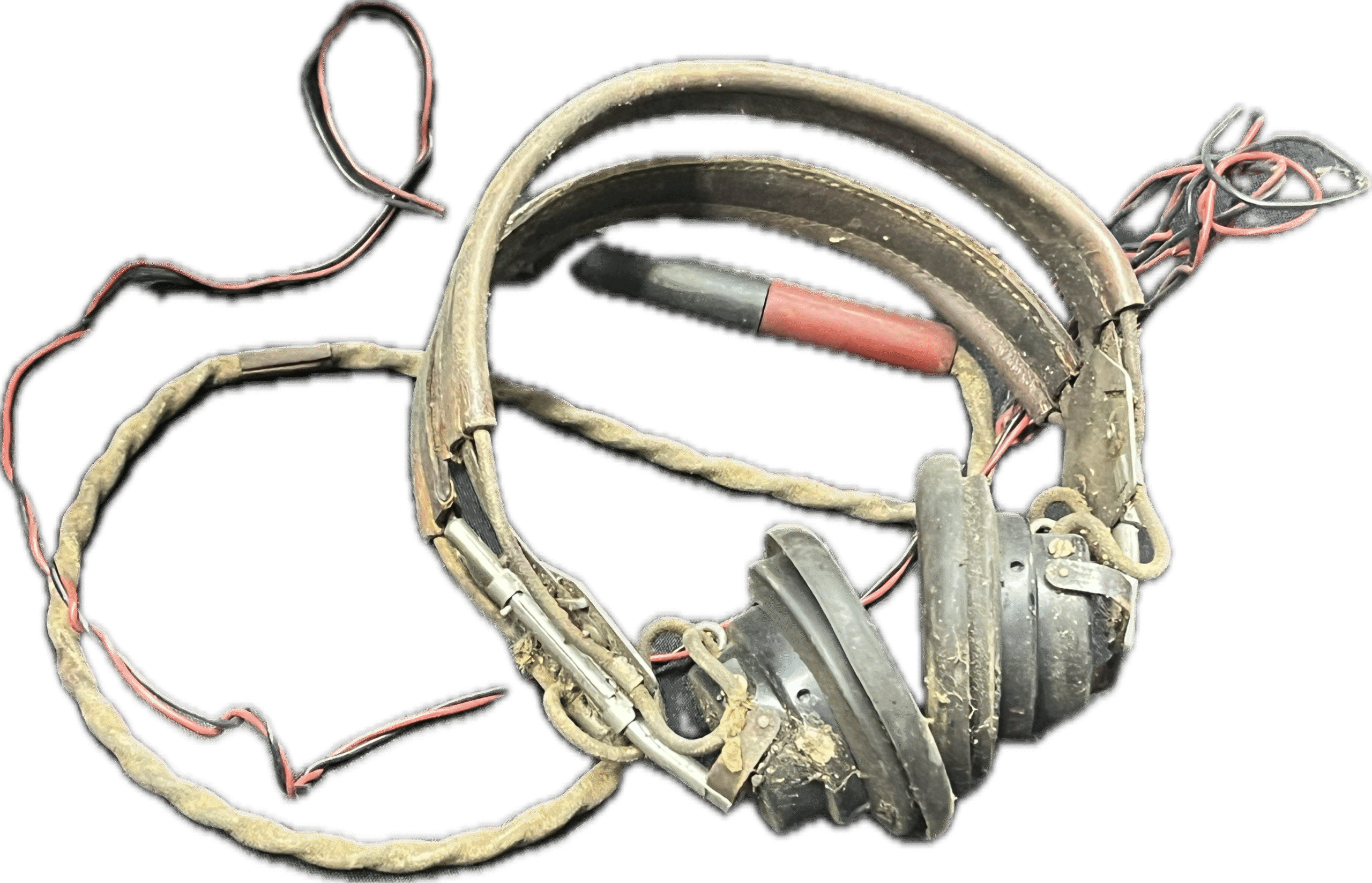 Vintage headphones with miscellaneous cords.