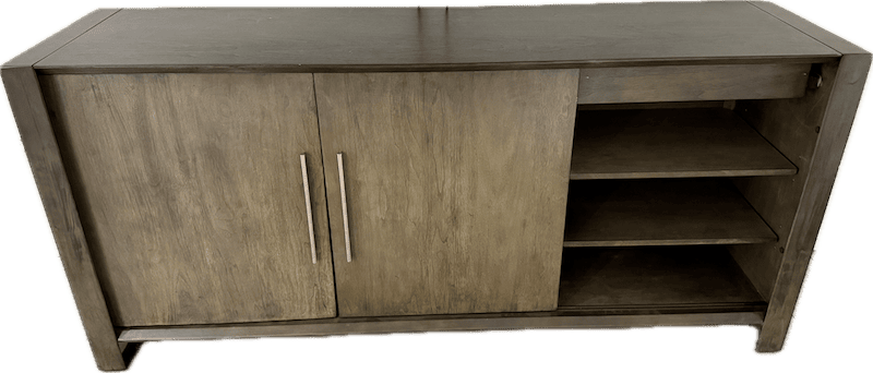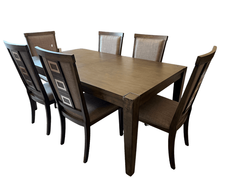 This contemporary dining set features a sturdy dark-wood rectangular table paired with six matching high-back chairs, and accompanying sideboard. The chairs include upholstered seats and backs in a warm neutral tone, with geometric square inlay detailing.