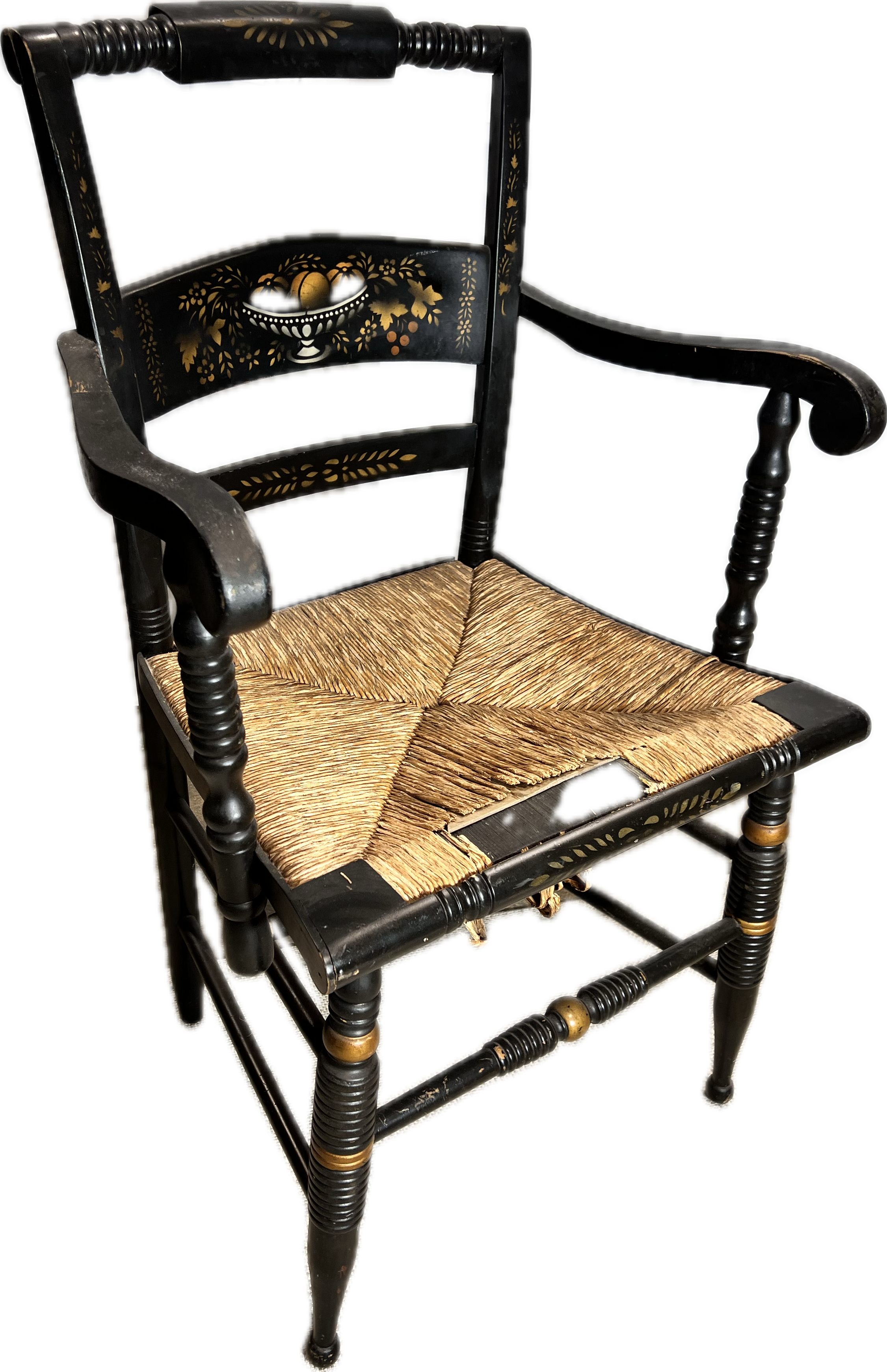 Antique signed Hitchcock black armchair with rush seat.