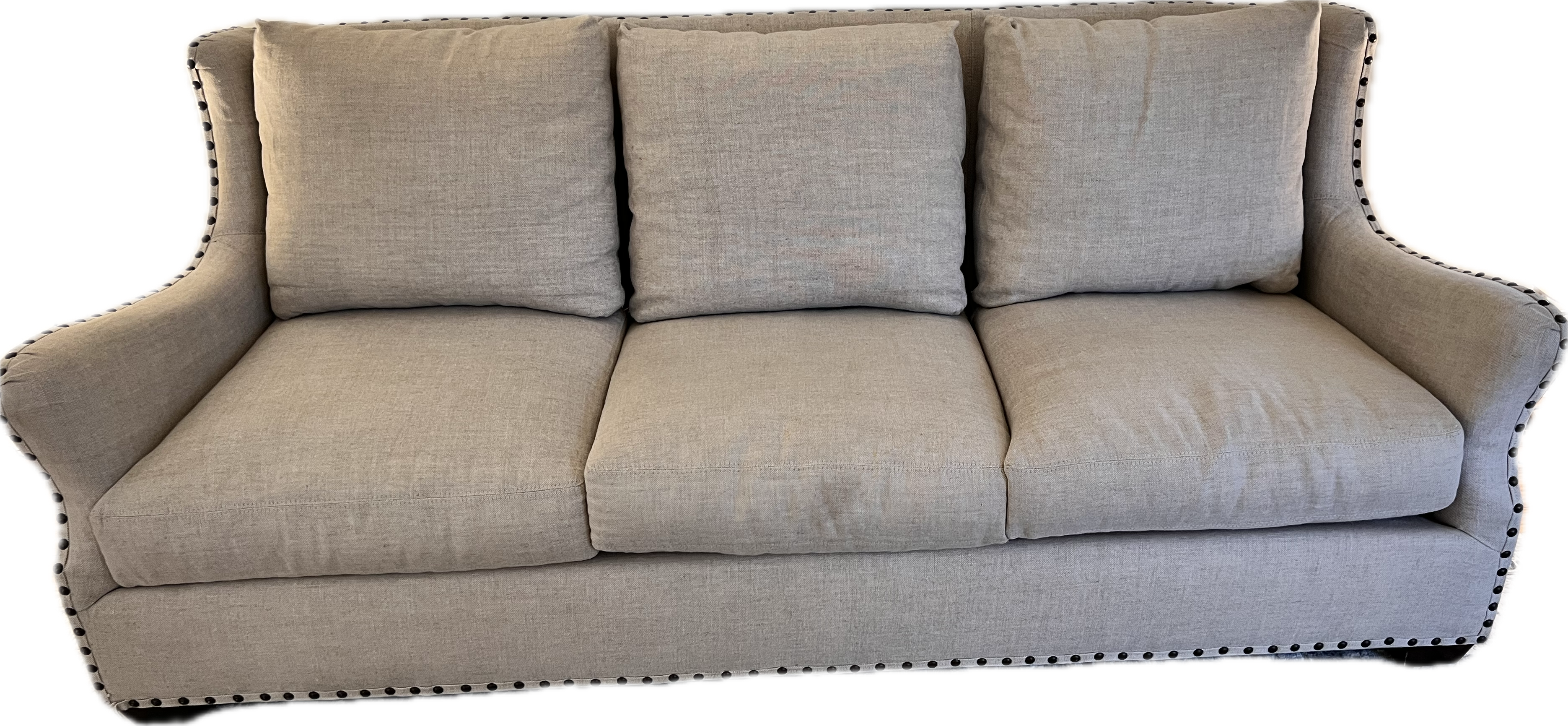 Beige linen sofa with scalloped back and bronze nailhead detail.