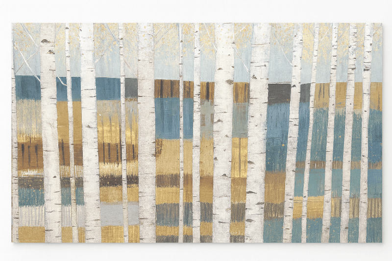 Print on wood of birch trees in earth tones.