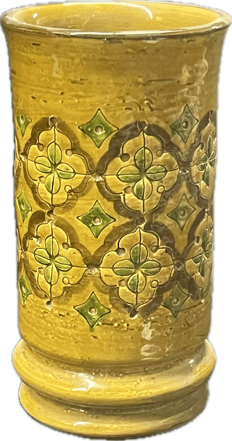 Yellow ceramic vase with green and brown floral details. Made by Aldo Londi for Bitossi circa 1960s.