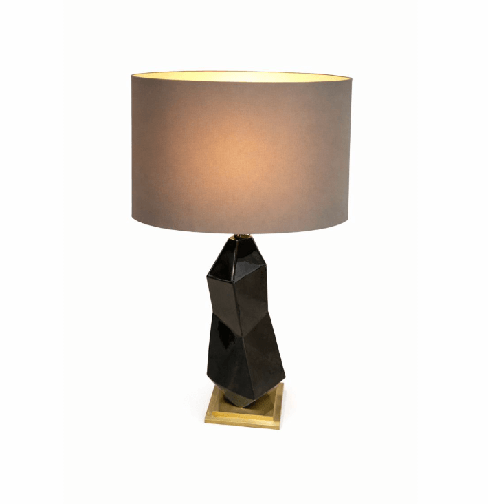 Tall table lamp featuring a sculptural, faceted black base with angular detailing and a square brass-toned foot. Paired with a cylindrical grey fabric drum shade.
