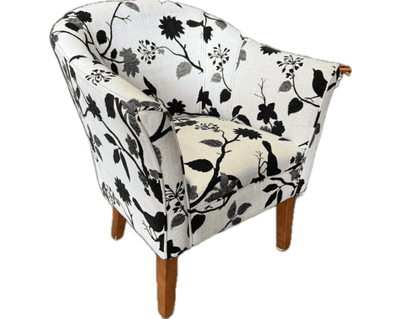 White chair with black floral bird print and wooden legs.