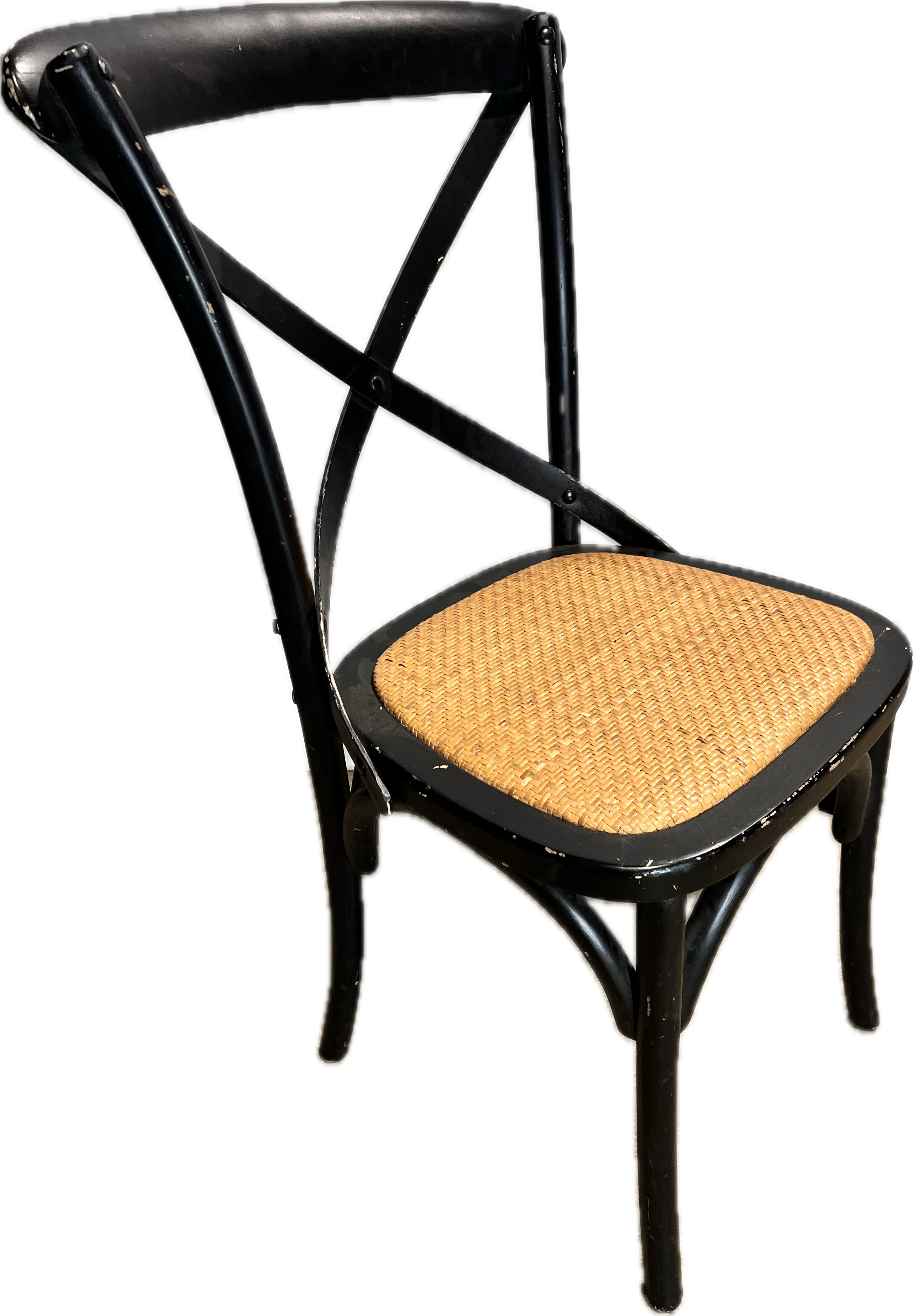 Black wood x back chair with rattan seat.
