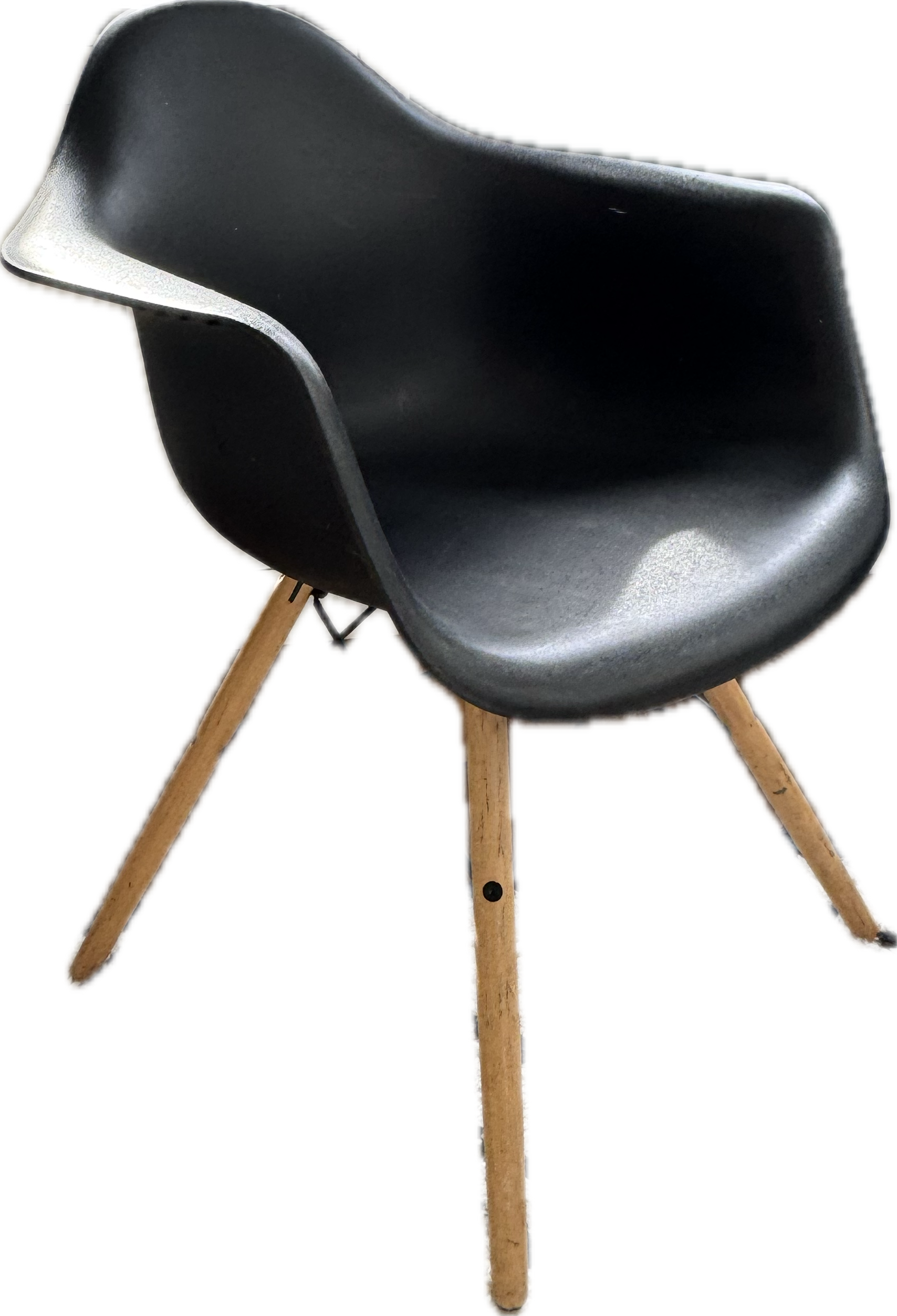 Matte black molded chair with arms and light wood legs.