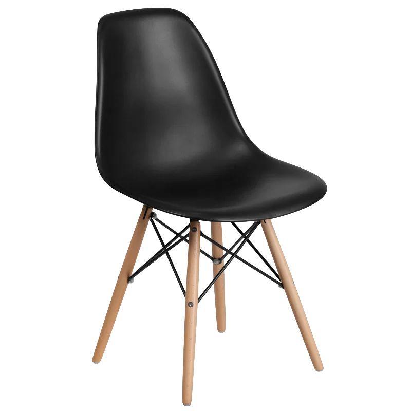 Black matte plastic bucket chair with light wood legs.