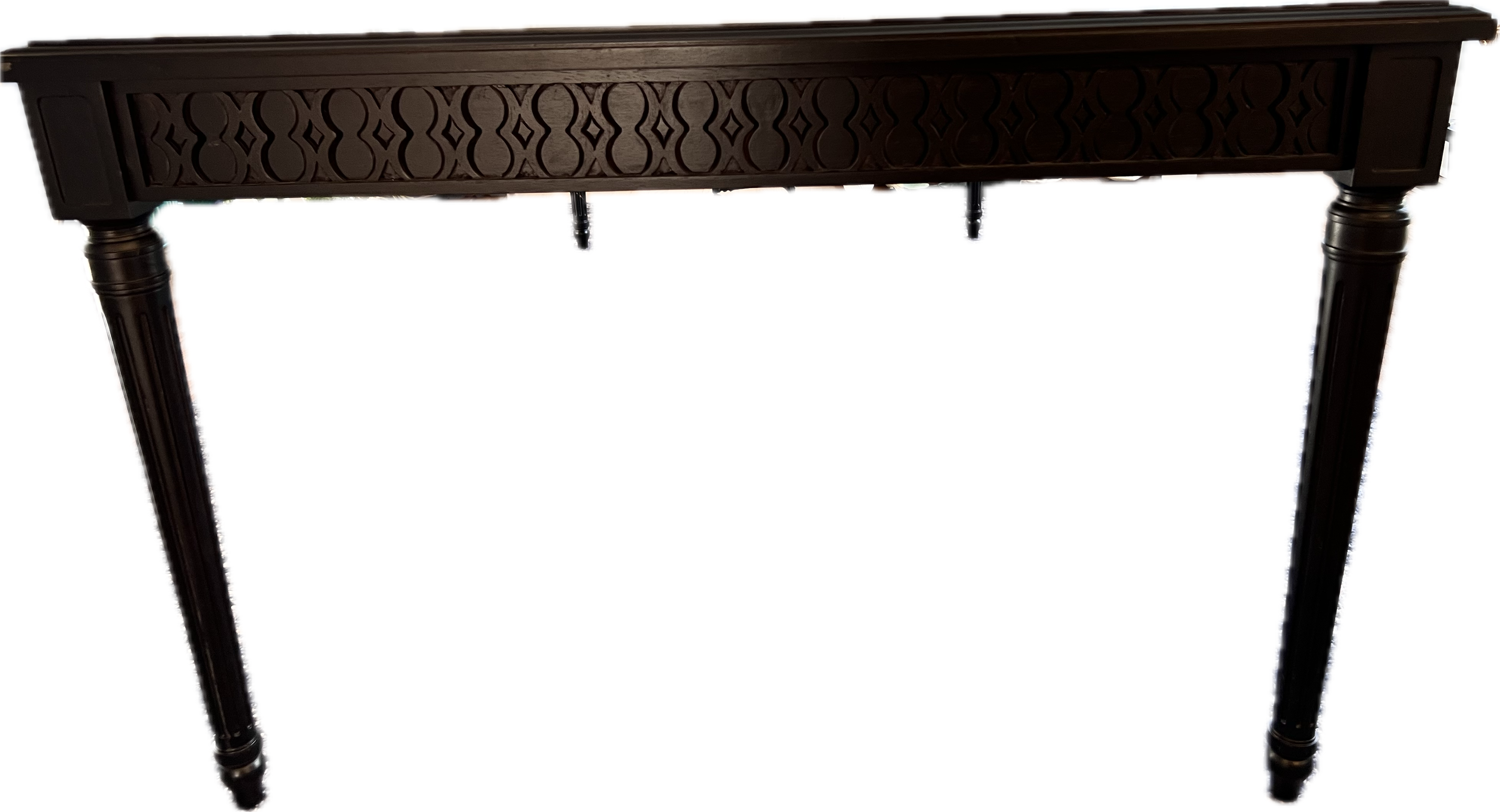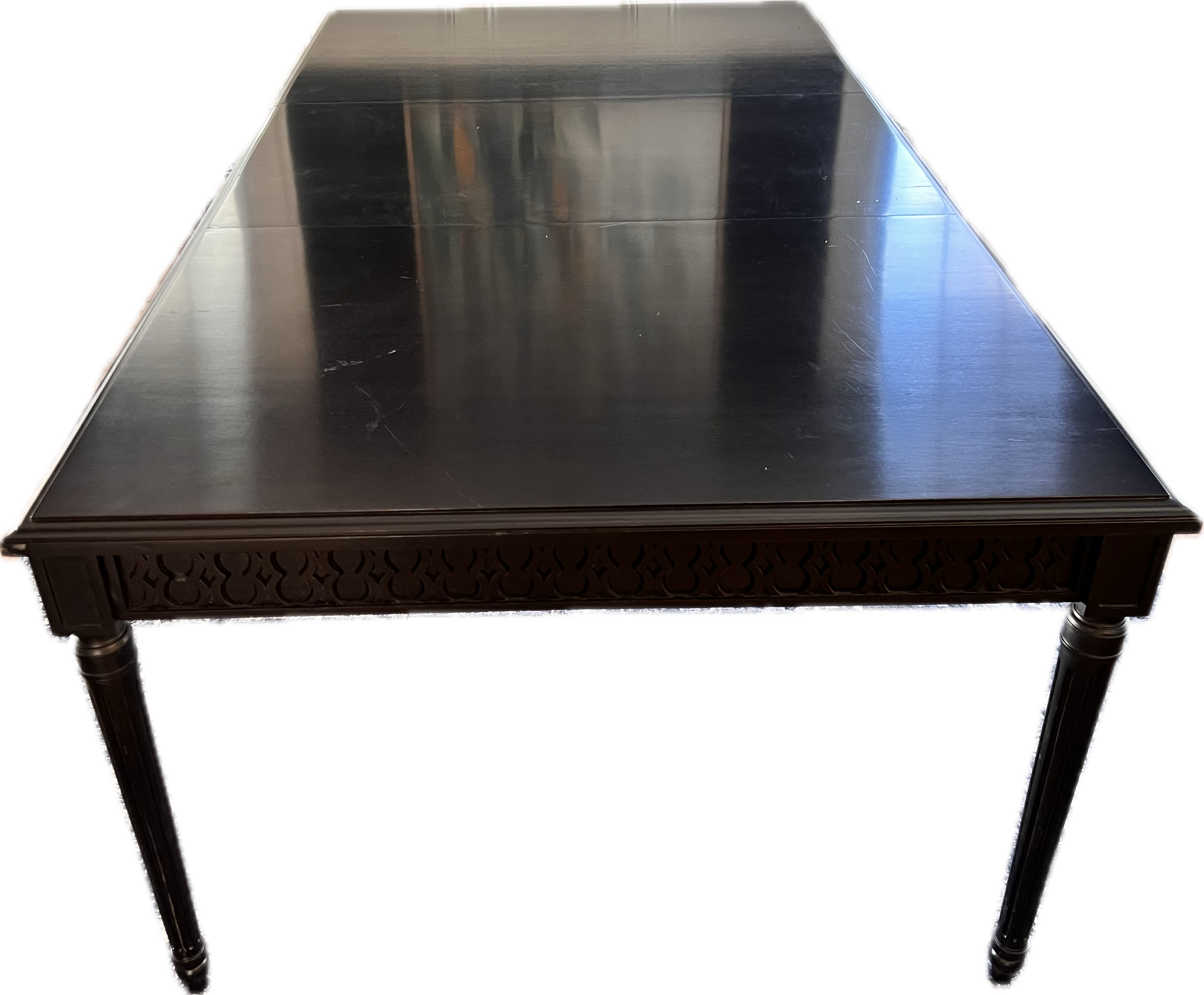 Black rectangular extension table. Round pattern design on apron.