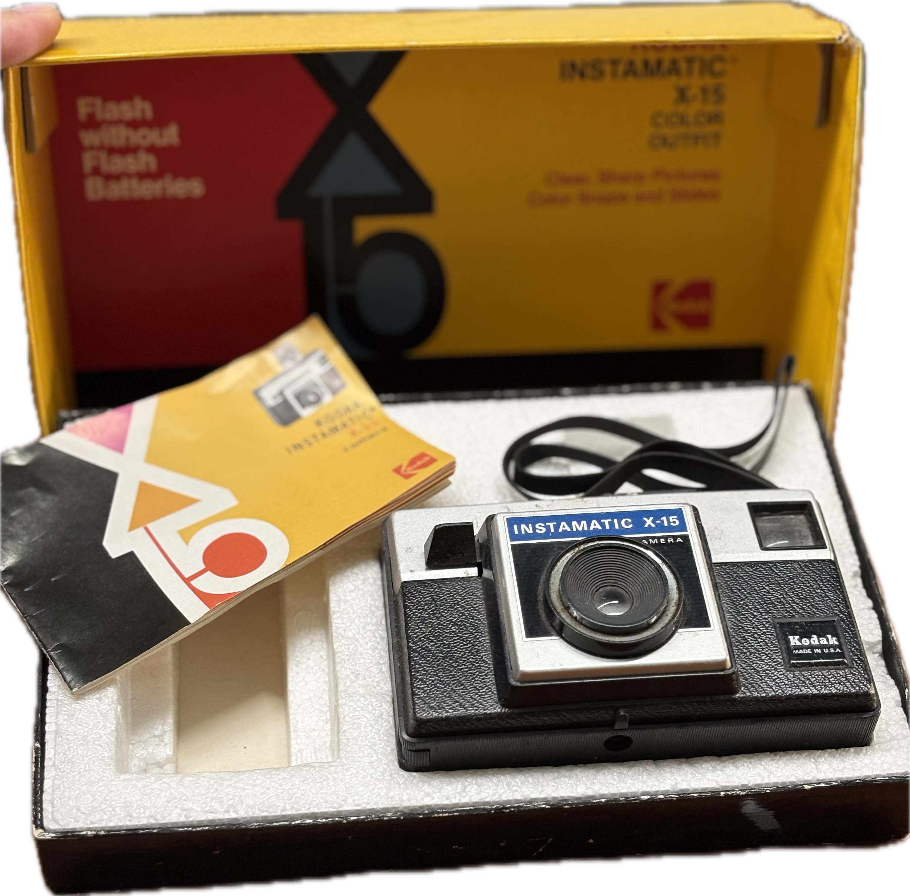 Kodak Instamatic x-15 color outfit camera in yellow box.