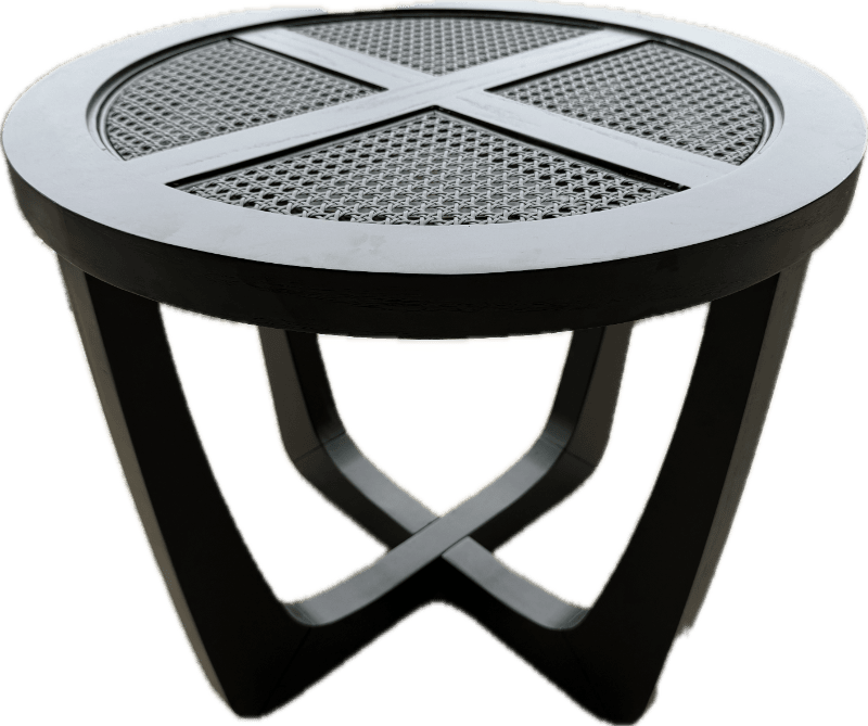 Striking modern round coffee table featuring a sculptural intersecting X-base and a rattan woven top inset. Finished in matte black with glass top.