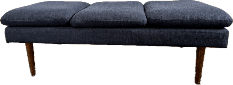 Rectangular upholstered bench with three fixed, cushion seat sections. Upholstered in a navy blue woven fabric with a low, streamlined profile.