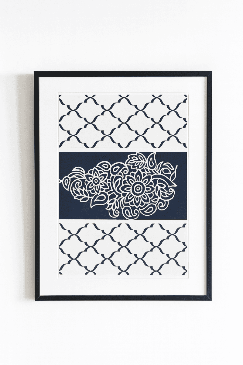 Blue and white quatrefoil pattern with blue and white floral design in the center.