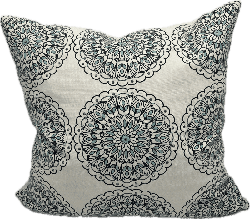 Cream square pillow with repeating blue medallion motif and metallic studded accents.