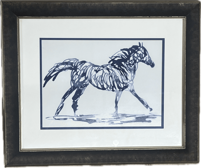 Blue ink drawings of a running horse.