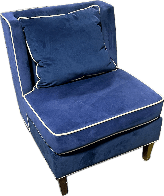 Armless slipper chair upholstered in deep blue ultra-suede with cream contrast piping along the seat, back, and cushion edges. Box seat cushion and loose back cushion. Tapered dark wood legs.
