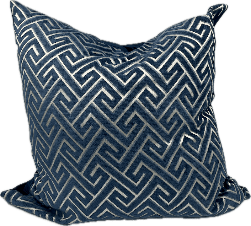 A plush navy velvet pillow featuring a raised maze-like geometric pattern in a soft silver tone.