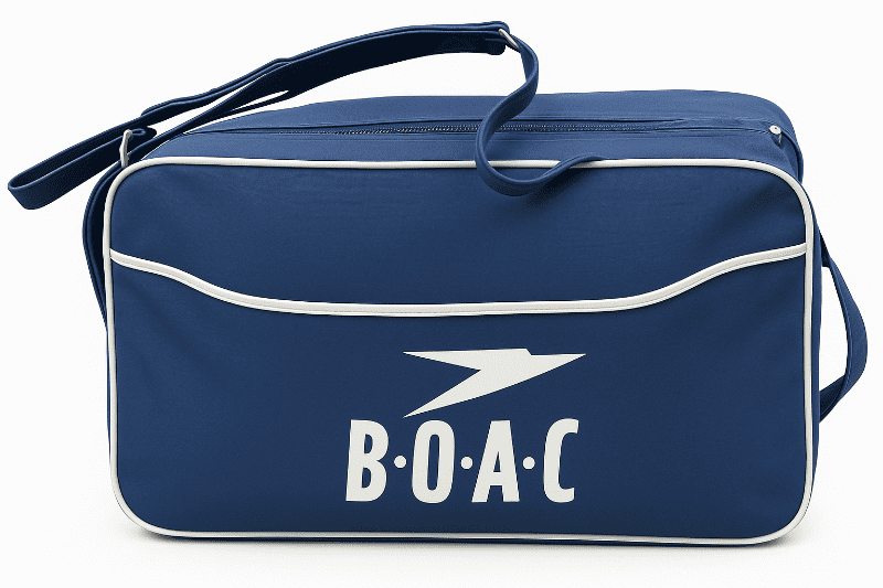 Vintage blue BOAC travel airline bag with white piping from 1960s.
