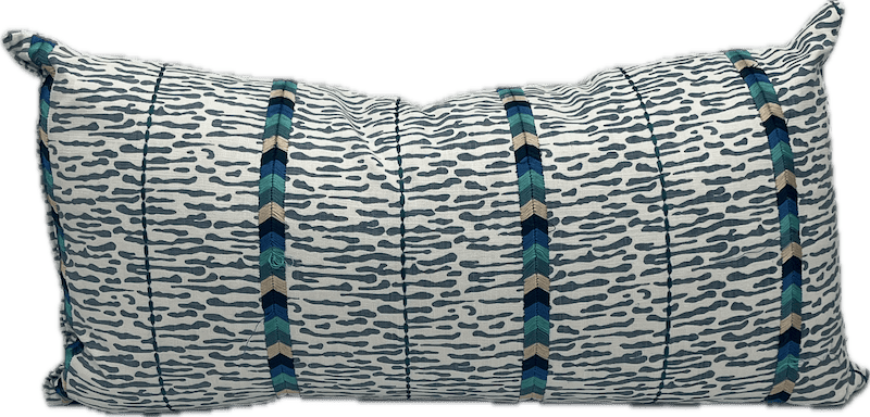Rectangular lumbar pillow with blue spotted pattern and multi colored chevron-patterned stripes.