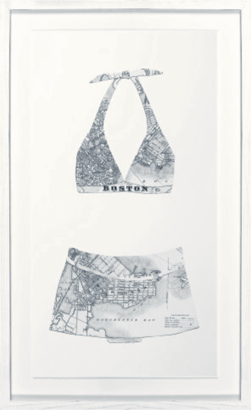 Print of blue vintage swimsuit made of Boston map on white matte in white frame.
