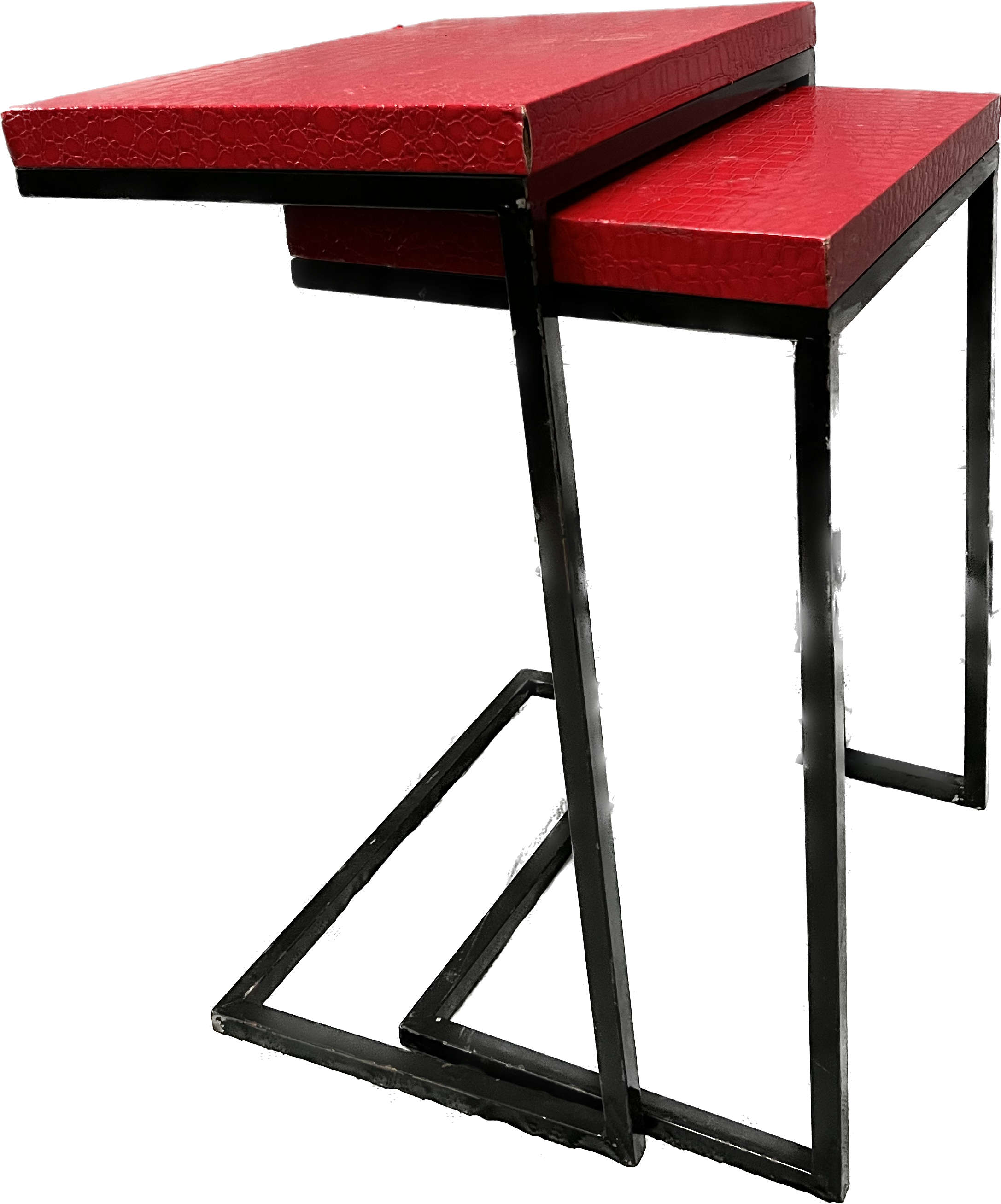 Set of rectangular nesting tables in red faux crocodile on black metal bases.