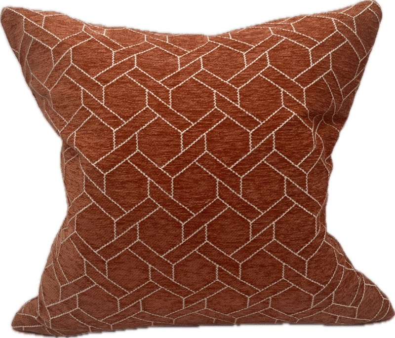 Orange pillow with white geometric chain link pattern.