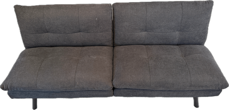 Upholstered futon with a low, modern profile. Back cushions recline fully, allowing the futon to lay flat for sleeping or lounge use.