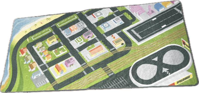 Children’s play rug featuring a vibrant illustrated city map with roads, buildings, and racetrack details.