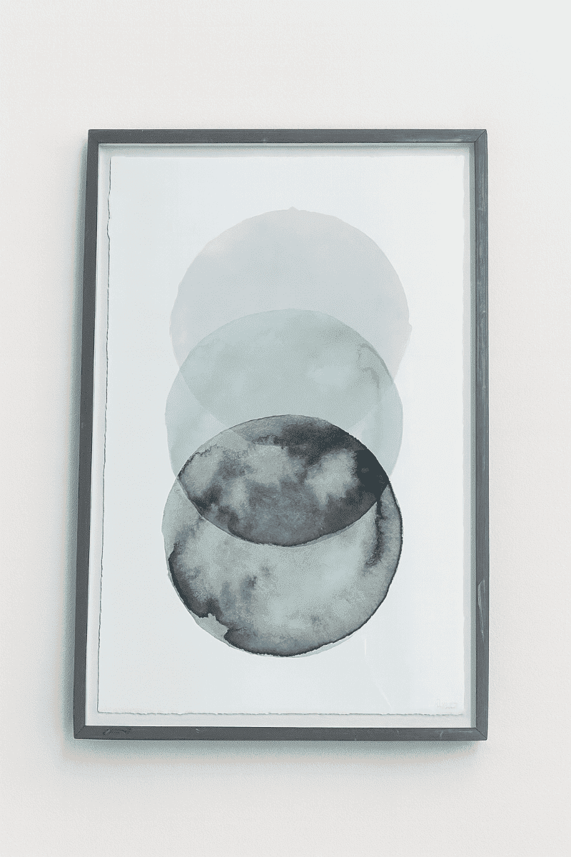 Modern minimalist framed art print featuring three overlapping circular moon phases in tonal shades of grey and black.