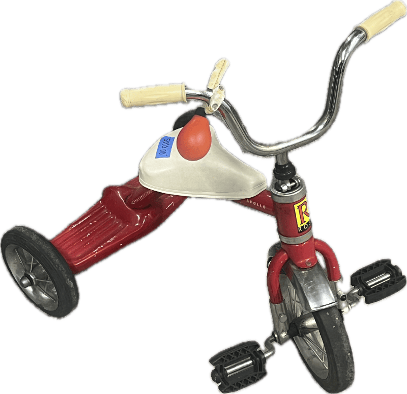 Classic children’s red tricycle with chrome handlebars, black pedals, and cream-colored grips. The sturdy metal frame features a white seat with an orange horn.
