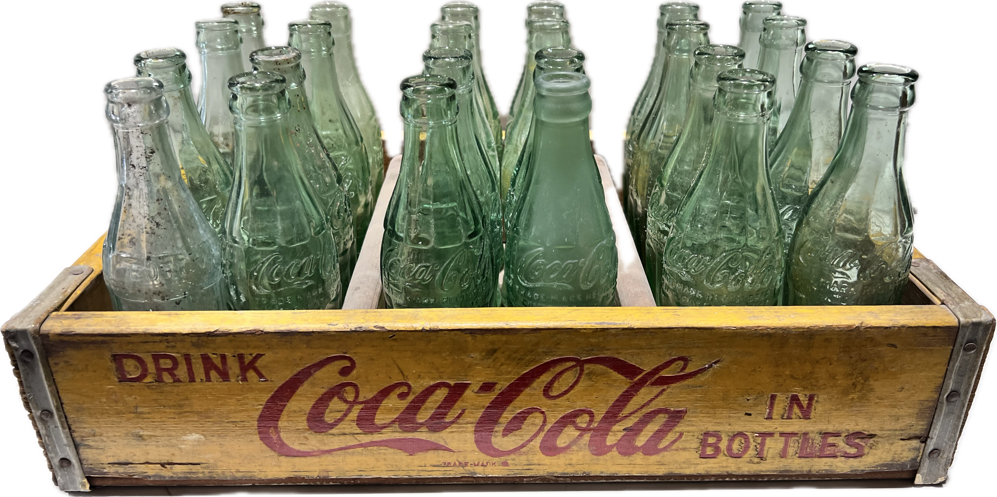 Vintage Coca-Cola 1950’s- 1960’s wooden yellow case with 24 empty green glass Coke bottles.