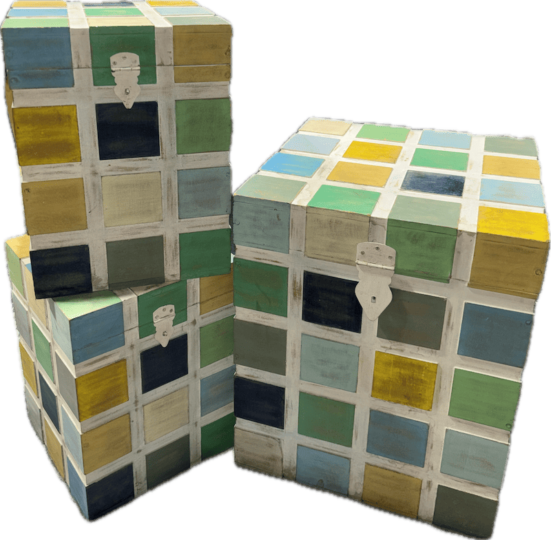 Set of three rectangular storage boxes featuring a hand-painted, color-blocked grid pattern in muted greens, blues, yellows, and neutrals. Each box includes a hinged lid with a metal latch closure. L 12”, W 12”, H 12” for two small pair