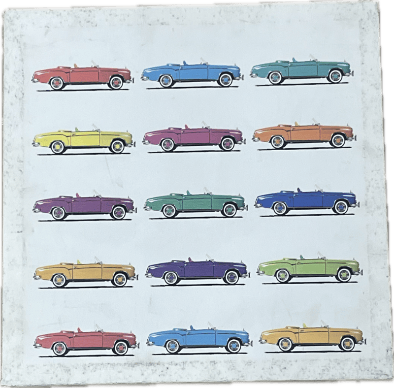 White background with assorted colorful convertibles in white frame.