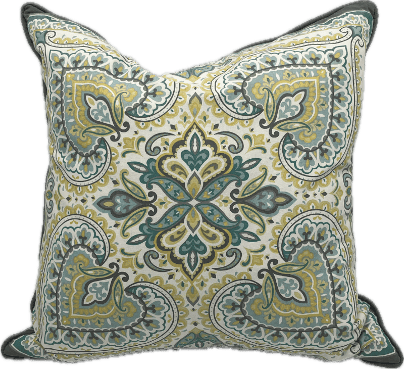 Intricate medallion print in shades of teal, mustard, and cream with blue piping.