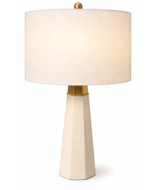 Table lamp with a tapered, faceted cream-colored base and a brass metal collar at the neck. Paired with a cylindrical off-white fabric shade and brass finial. Simple silhouette with subtle geometric detailing.