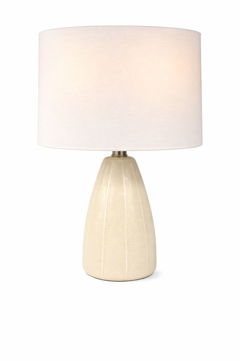 Ceramic table lamp with a gently tapered silhouette and subtle vertical texture. Finished in a warm glaze and paired with a classic white drum shade.
