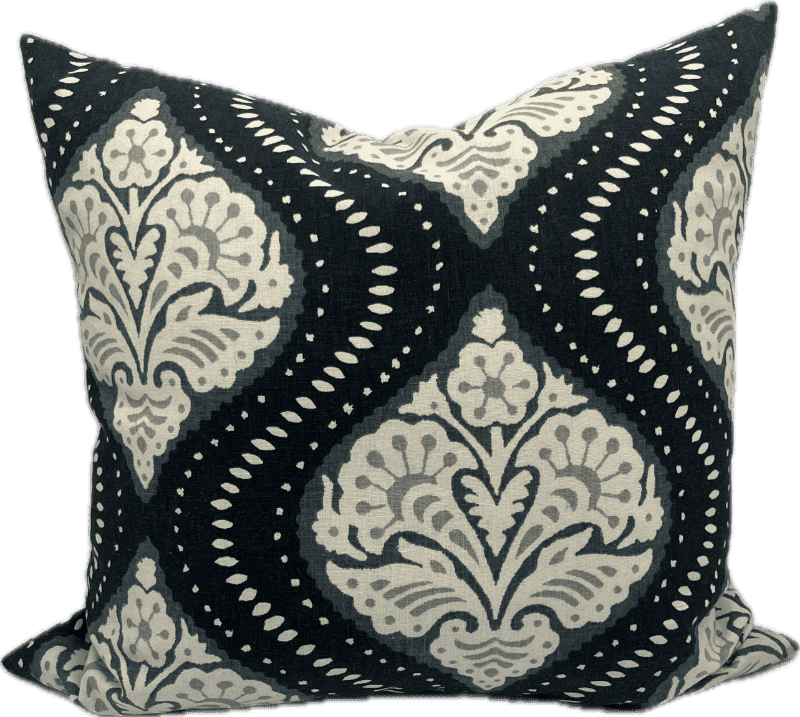 Elegant blue, white and grey damask pillow.