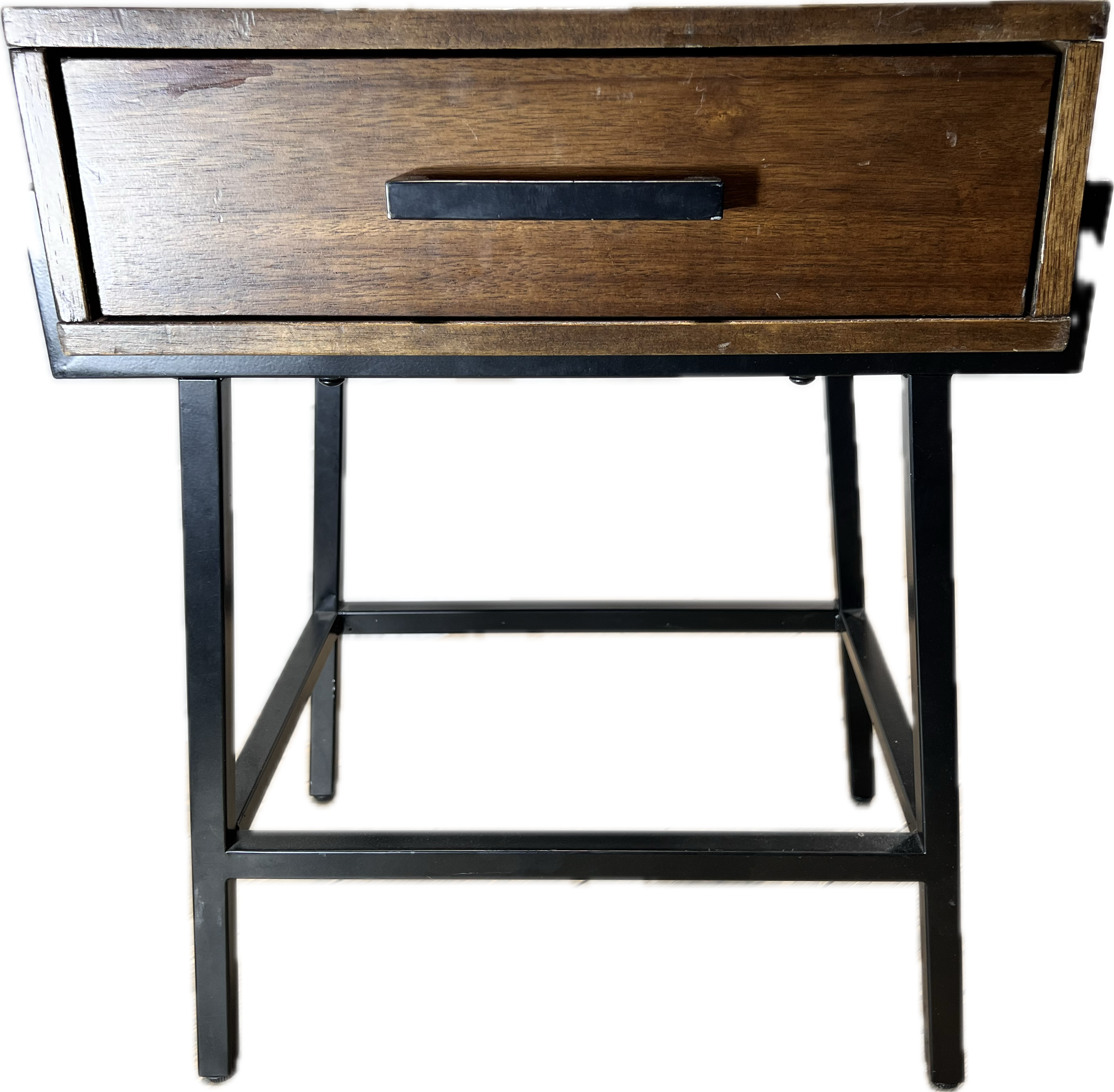 Dark wood bedside table with 1 drawer on black metal base.
