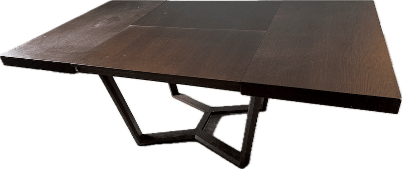 Rectangular (when extended) dining table featuring a dark stained wood top with subtle panel detailing. Supported by a bold, geometric metal base with intersecting angular legs. 44 x 44 square without the integrated leaf.