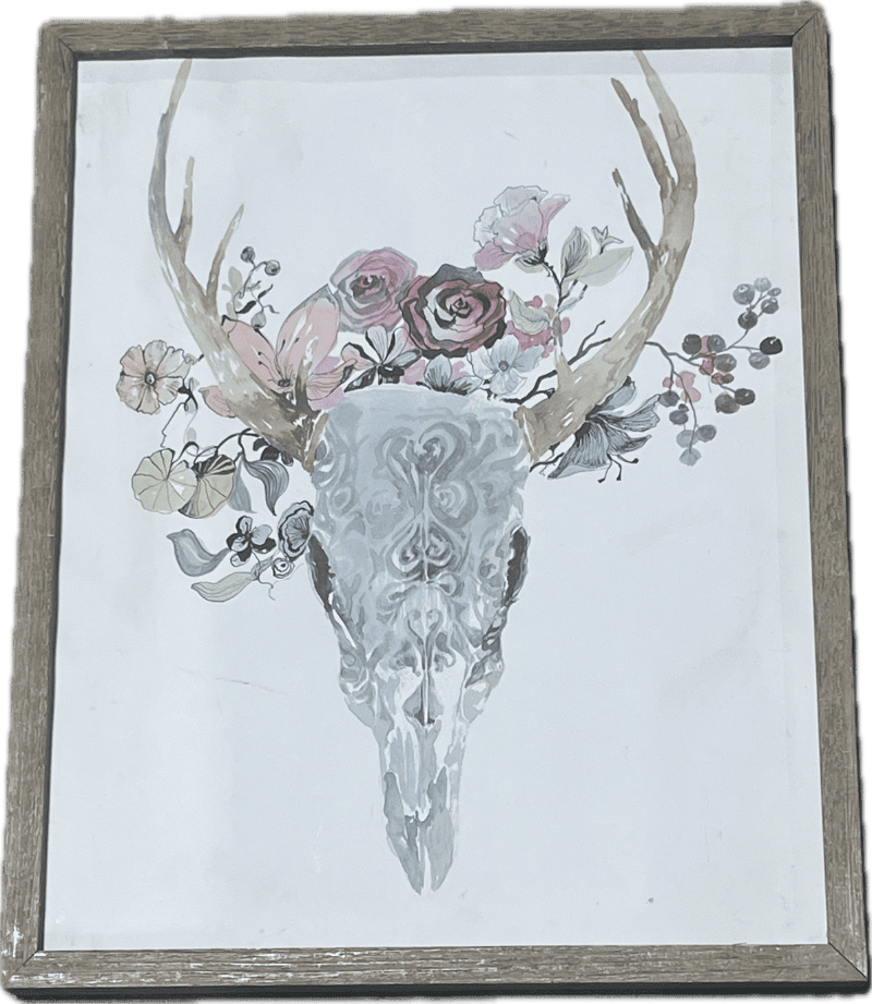 Watercolor image on white background of a grey deer skull with pink flowers.
