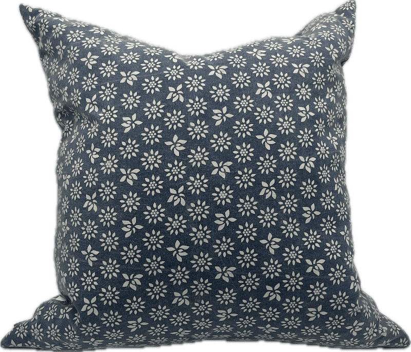 A soft square pillow in indigo blue with an off-white floral block print design and hand-stamped look.