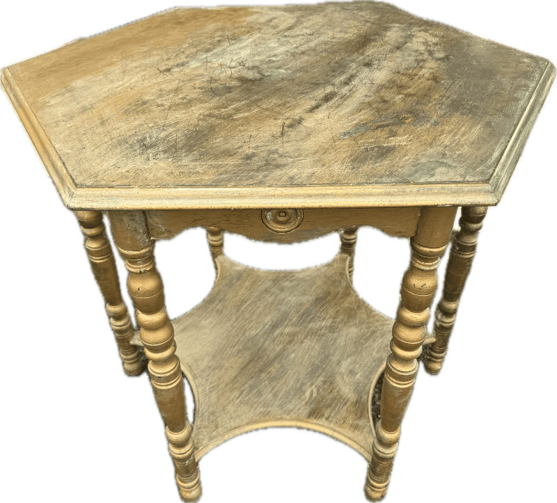 Vintage hexagon side table with a distressed top and light wood base featuring turned legs and a lower shelf.
