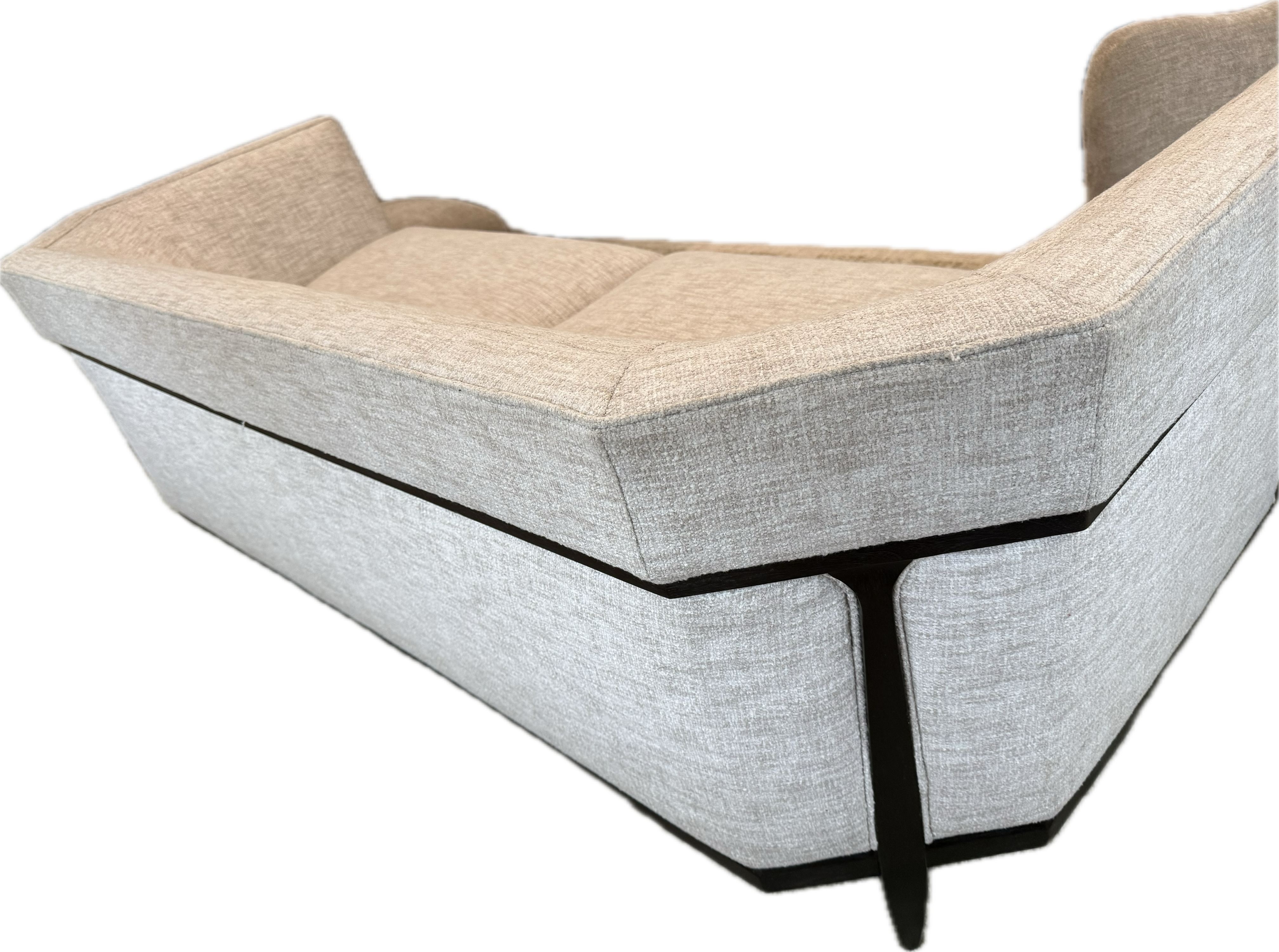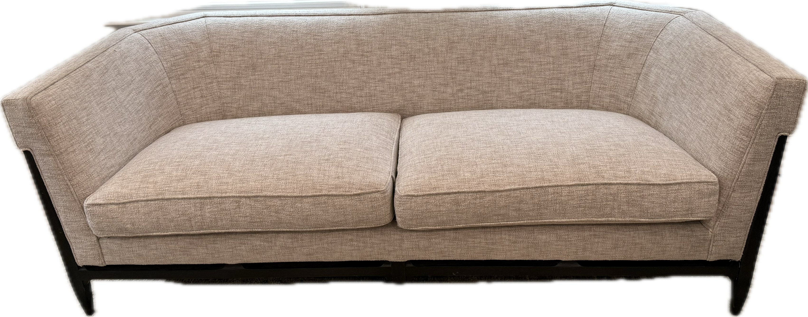 Elegant outline style sofa with black detail. Tight back, with angled corners. Caracole brand.