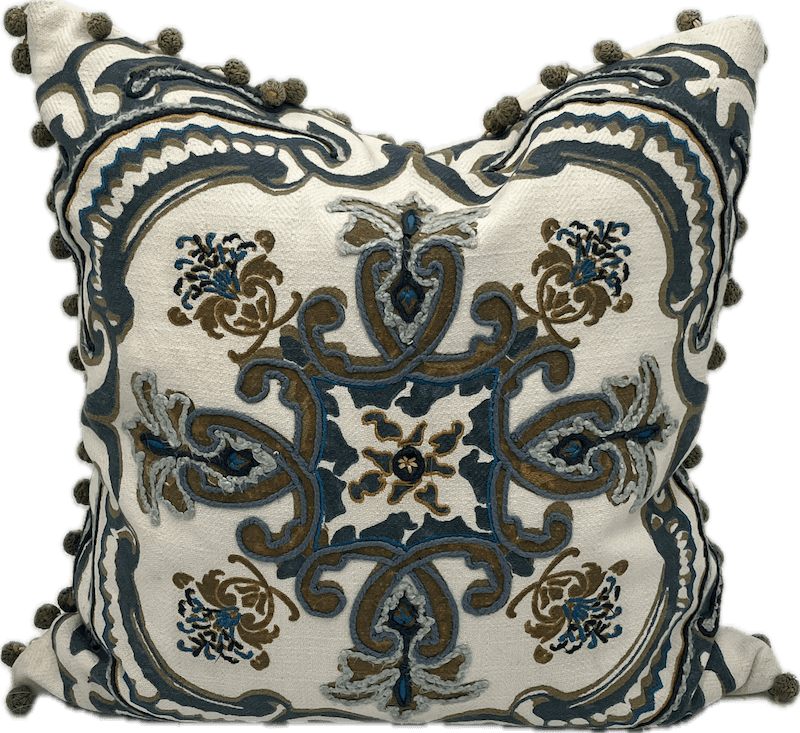 Embroidered damask-style pattern on cream pillow, with pom-pom tassels around the sides.