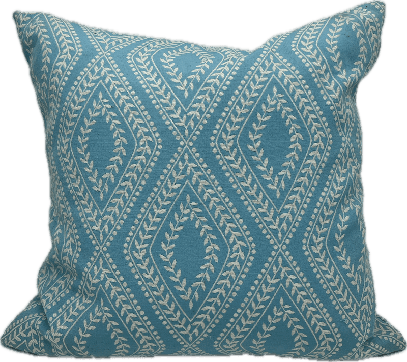 Square pillow with a diamond and vine motif in blue and white. Textured embroidery adds dimension and subtle pattern.