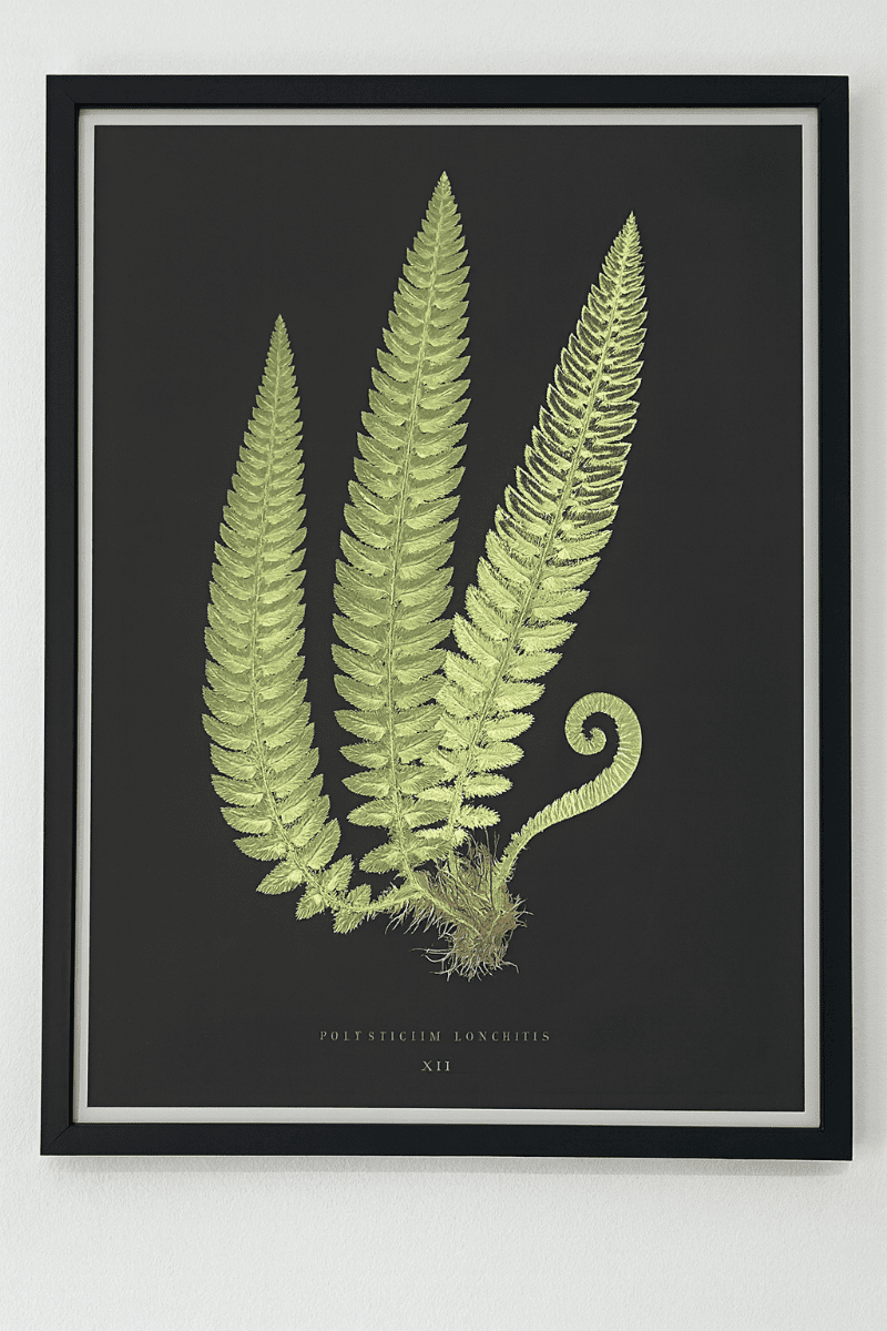 3 green fern leaves on black matte with text “polystichum lonchitis” with black frame.