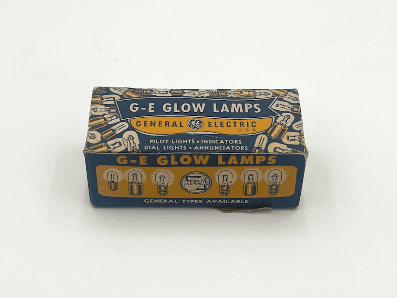 Vintage mid-20th-century box of G.E. Glow Lamps (General Electric). Original blue and yellow packaging with detailed graphics and typography.