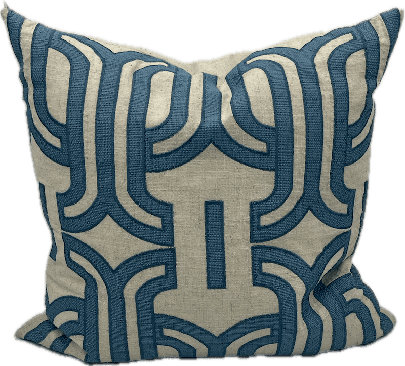 Square linen pillow with bold fabric in a repeating blue geometric pattern on a cream background.
