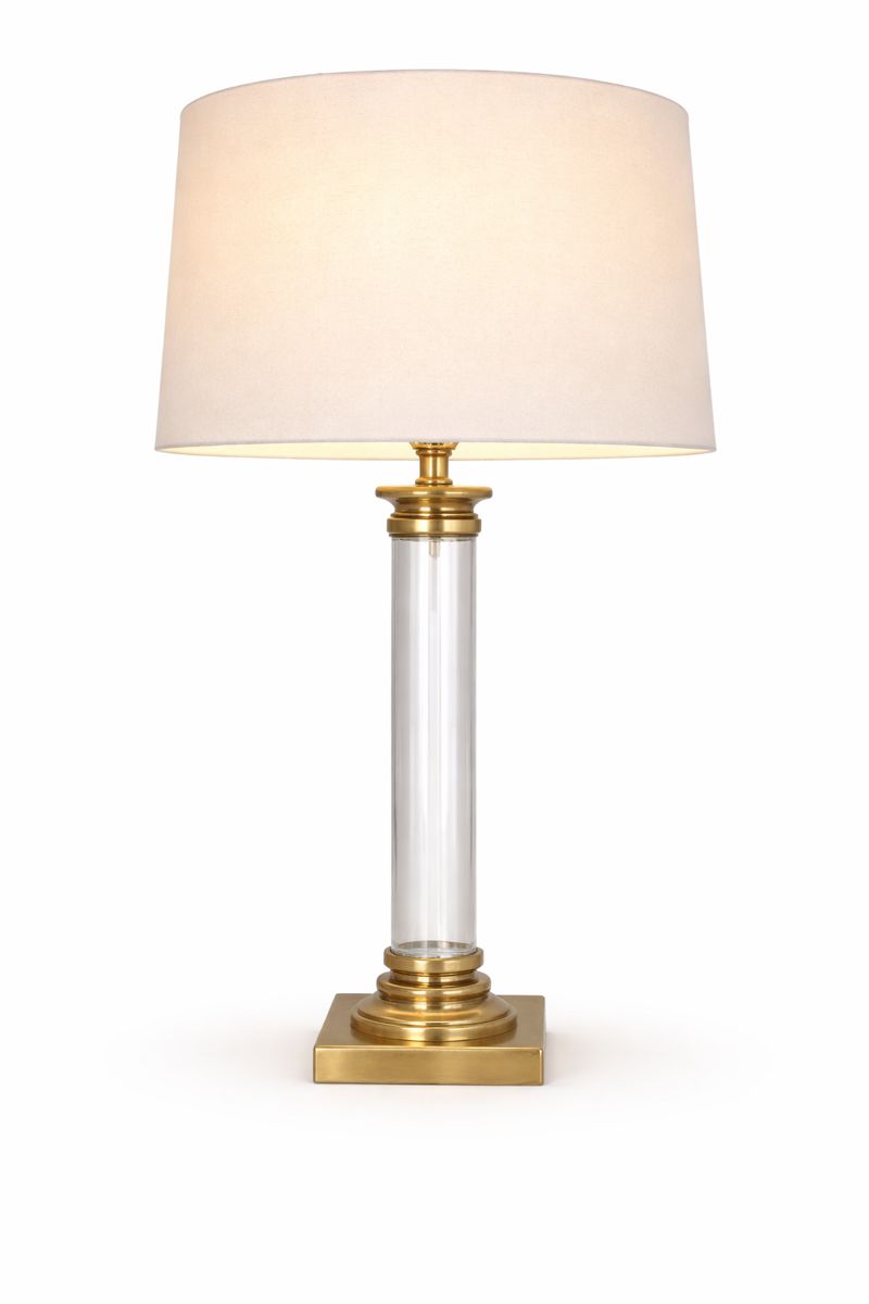 Table lamp with a clear cylindrical glass column and polished brass-tone metal detailing. Features a stepped brass base and matching brass accents beneath the socket with a tapered fabric shade.